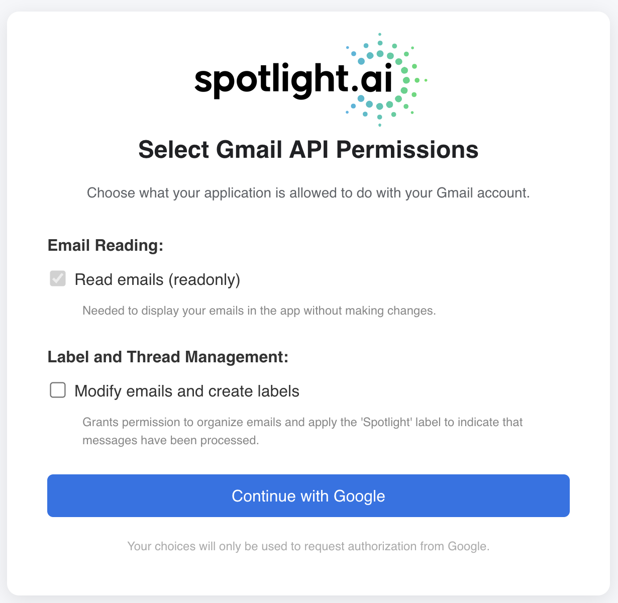 - This optional permission allows Spotlight.ai to organize your emails by creating and applying labels. When enabled, Spotlight.ai can apply a label for you, indicating that specific messages have already been processed.