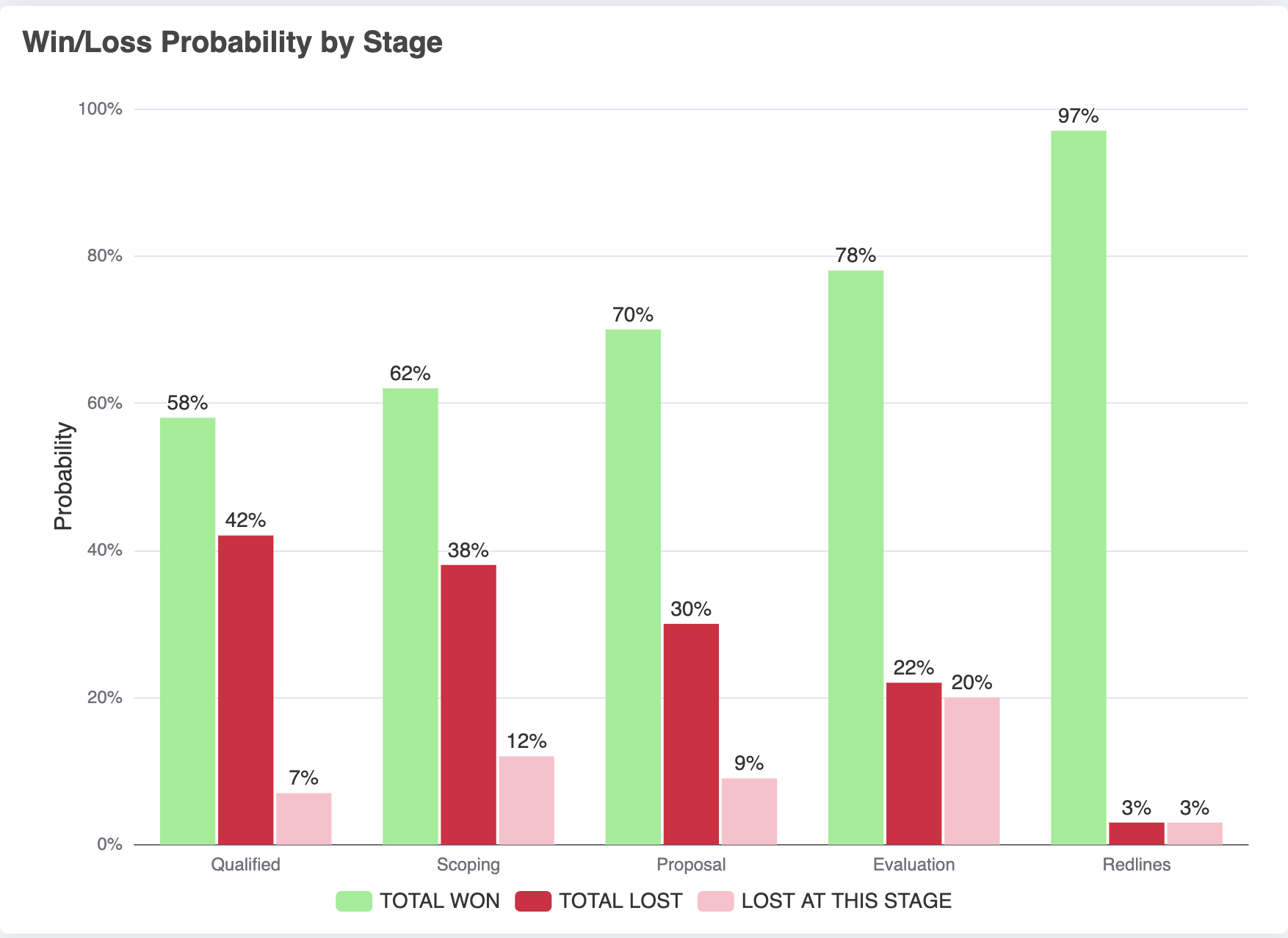 The Win/Loss Probability by Stage chart shows how deal outcomes evolve as opportunities progress through the sales funnel. For each stage, it displays: