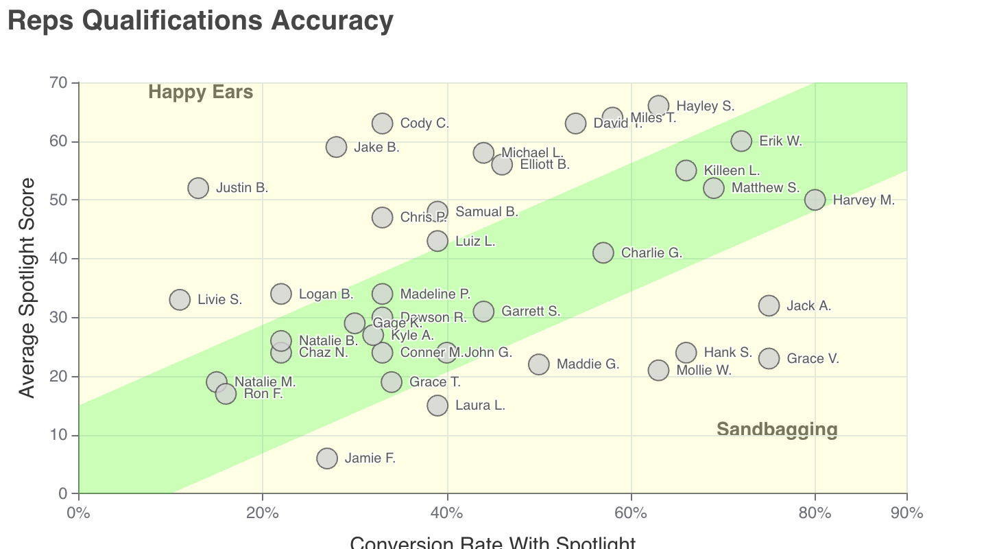- The x-axis shows the rep’s conversion rate.