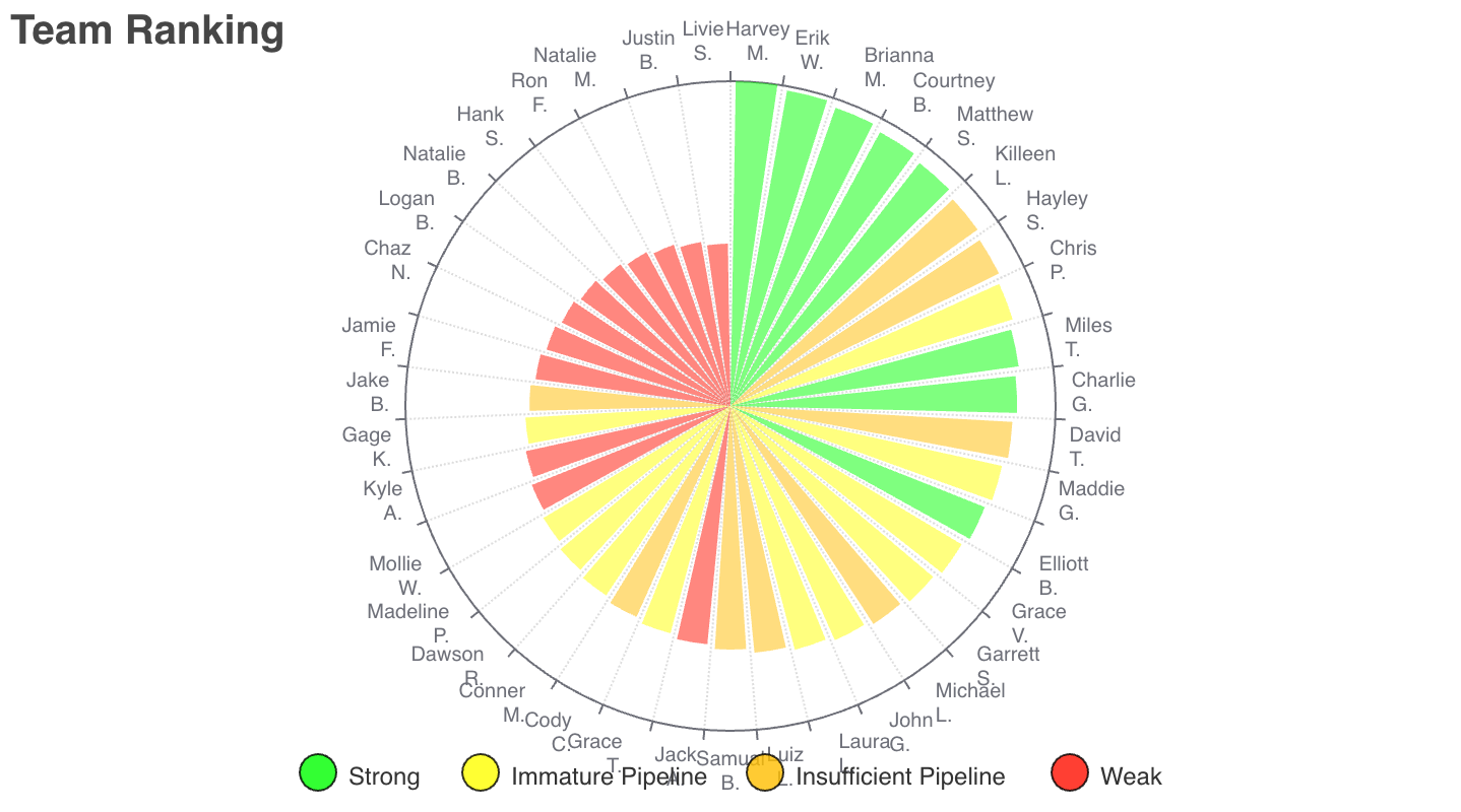 The Team Ranking chart provides a relative view of rep performance by ranking the sales team based on a combined measure of pipeline strength and deal quality.