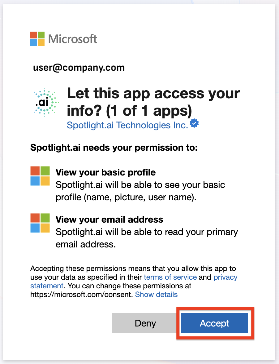 - Click Accept to continue. Note: this step will fail if your IT organization restricts use of Sign in with Microsoft to authorized organizations. If this is the case, please create an internal request with IT to authorize spotlight.ai websites for Sign in with Microsoft.