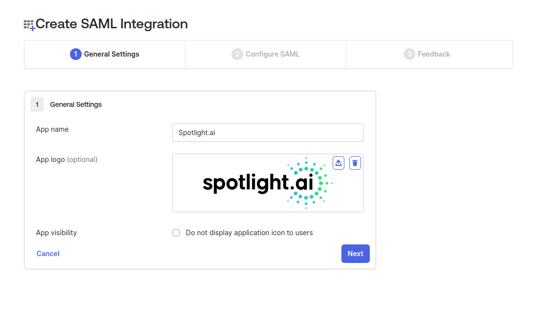 - In the Create SAML Integration dialog, set the App name to Spotlight.ai, App logo to https://spai-logos.s3.us-east-1.amazonaws.com/spotlight/Spotlight_BlackText_TransparentBG-Okta.png then click Next.