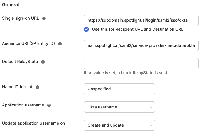 On the General step, set Single sign-on URL to https://SPOTLIGHT_PROVIDED.app.spotlight.ai/login.saml2/sso/okta (replacing SPOTLIGHT_PROVIDED). Set the Audience URI (SP Entity ID) to https://SPOTLIGHT_PROVIDED.app.spotlight.ai/saml2/service-provider-metadata/okta.