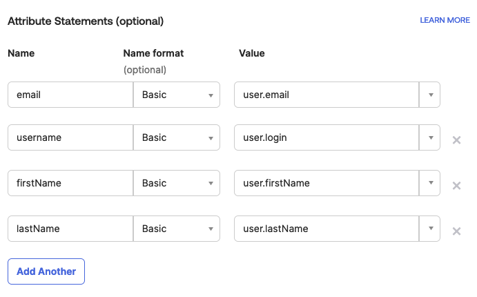 - In the Attribute Statements (optional) section, configure the following fields then click Next.
