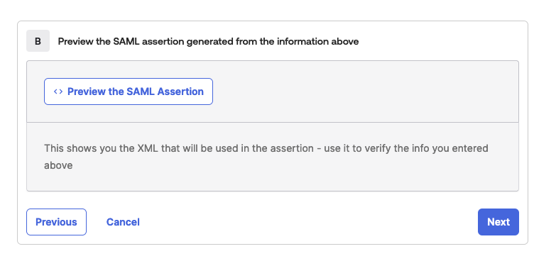 - On the Preview the SAML assertion generated from the information above, click Next.