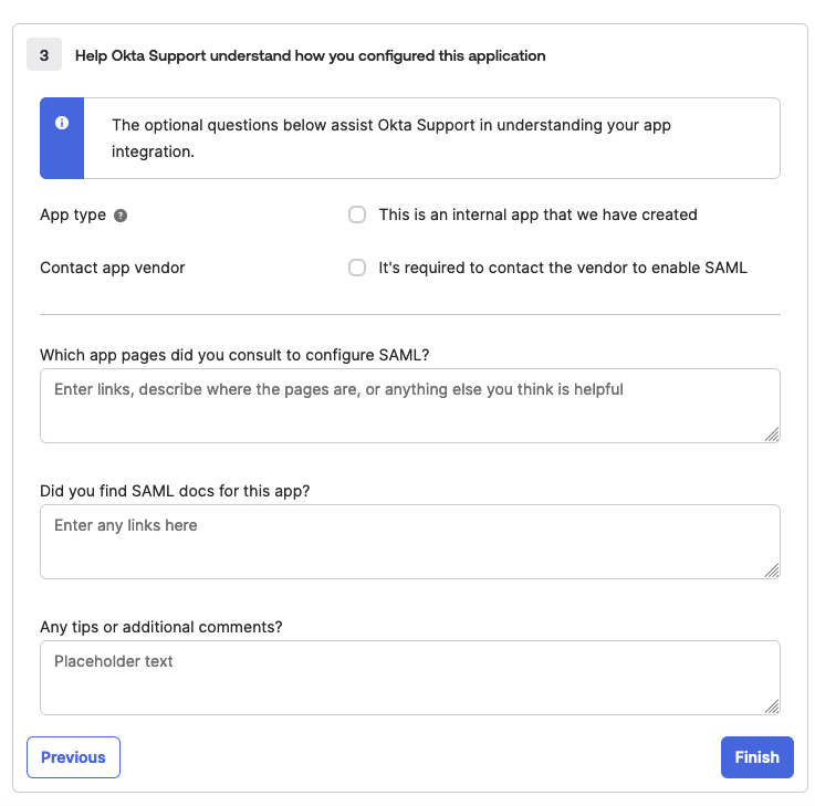 On the Help Okta Support understand how you configured this application step, click Finish.