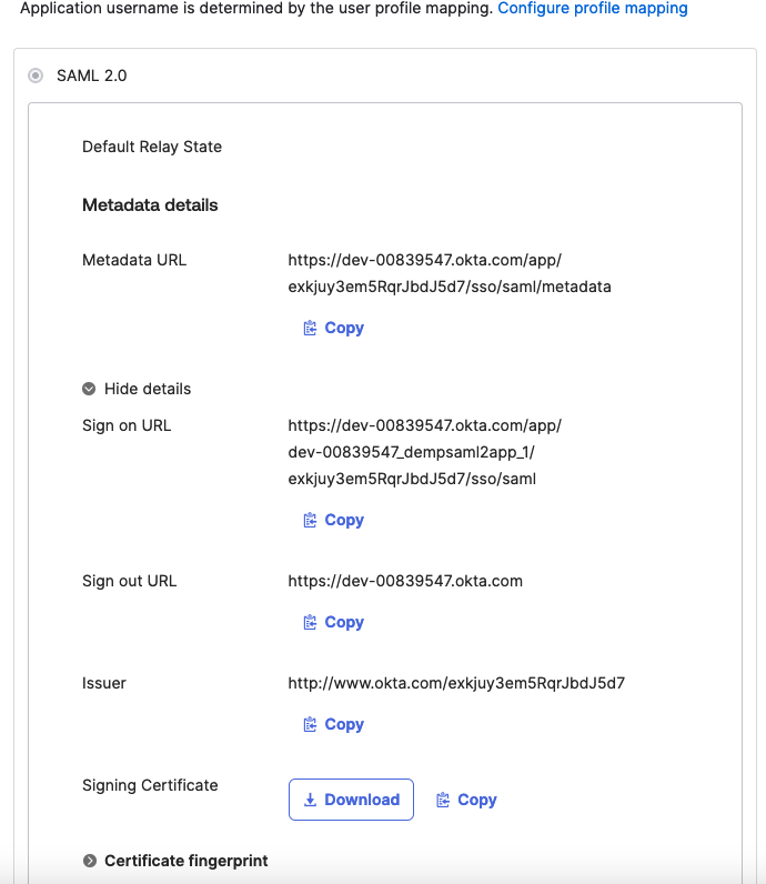 - Open the newly created app configuration, click Download next to Signing Certificate and send this and the Metadata URL to Spotlight.ai Support.